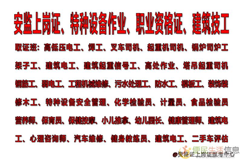 特种设备安全管理,锅炉司炉、起重机司机、叉车司机、客运索道司机、客运索道维修、大型游乐设施维修、大型游乐设施操作、电梯维修安装、起重机指挥、观光车司机、移动压力容器充装、锅炉水处理等等其它均可