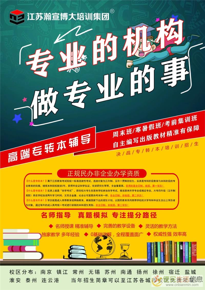五年制专转本培训辅导首选江苏瀚宣博大专转本,江苏瀚宣博大专转本不管是师资力量、办学辅导经验,还是内部材料,甚至是各大主考院校合作经验都位于江苏省五年制专转本培训界的前列。十余年的本土深耕,让瀚宣博大积累了无数江苏考生的信任,也收获了“零投诉”的行业口碑欢迎www.cnbianmin.com。2026年江苏瀚宣博大专转本全省各城市校区招生现已全面开启!我们针对不同基础的同学开设多种班次,特别开设英语零基础班,从零起步、循序渐进,基础薄弱也能轻松跟上。采用滚动开班模式,随到随学,灵活适配你的时间安排。专业课提前对接最新考纲,考点精准梳理,课程全程上到考前,学习不间断、备考不松懈便~民~生~活~信~息。